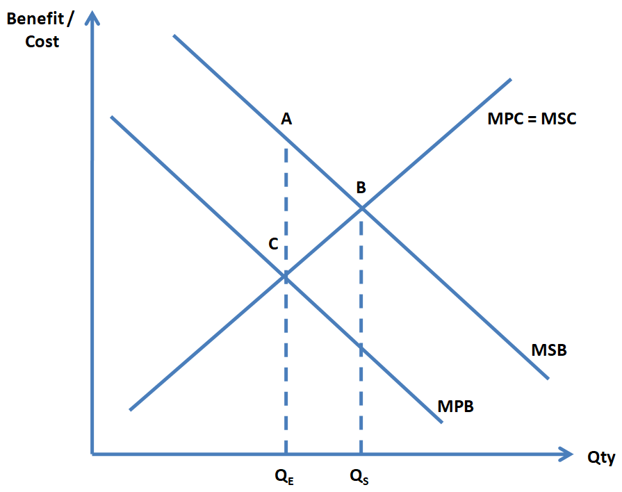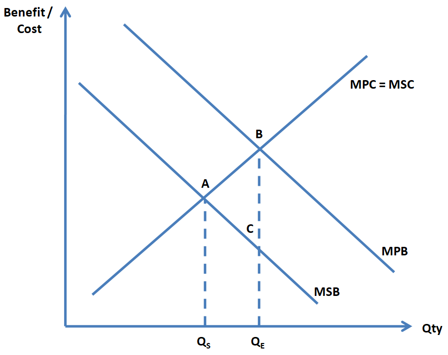 The end-result is over-consumption (the market consumes at Qe instead of the socially optimal point at Qs), and a resultant dead-weight loss of the area ABC.