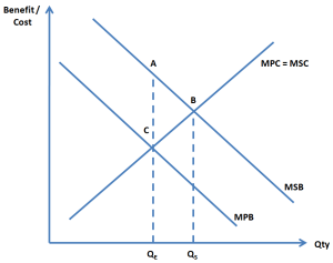 As seen in the graph above, the Marginal Private Benefit (MPB) experienced by the individual is higher than that experienced by society as a whole (Marginal Social Benefit – MSB), because the convenience of indiscriminate parking poses additional cost to society.