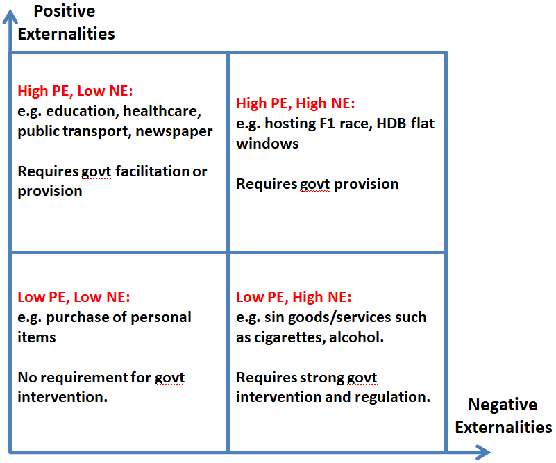 In the above diagram, the top right quadrant represents a type of good or service that exhibits high positive and negative externalities. The bottom left quadrant represents that of low positive and negative externalities.
