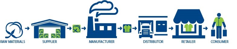 In a typical simplified form, the journey from raw materials to consumption purchase takes the form of the classic supply chain with the following steps: