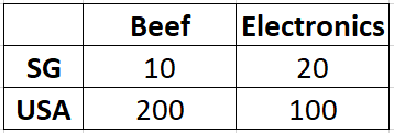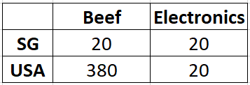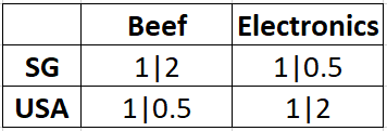 On the other hand, in the case of electronics, Singapore sacrifices 0.5 units of beef for every unit produced, whereas USA sacrifices 2 units of beef.