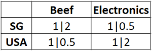 Therefore in this example, both USA and Singapore will find trade mutually beneficial as long as 1 beef is traded for x electronic, where 0.5 < x < 2.