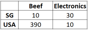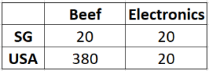 Let’s try to make Singapore better off, and see if USA is better off with trade too. For convenience, let’s assume that the terms of trade = 1 beef :1 electronic (i.e. 1-to-1 exchange for both goods).