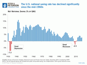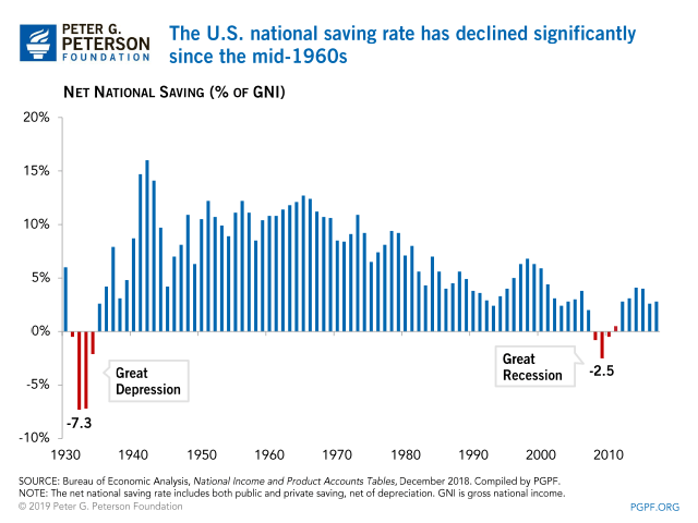 In that case, the investments that the country would be able to make, will be constrained by its level of national savings, which spells bad news for countries with low levels of national savings such as the USA, whose relative national savings have been declining for decades, as seen in the graph below (courtesy of the Peter G. Peterson Foundation):