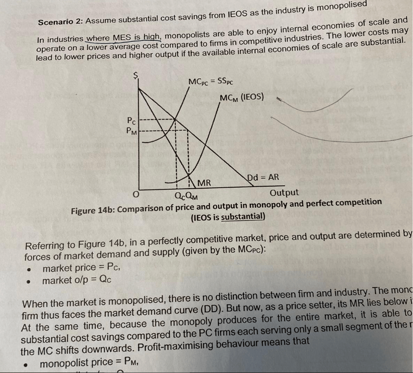 - I thought internal EOS will cause the equilibrium price/output to move along the AC curve. With the lowering of the MC as compared between the perfectly competitive firm versus the monopoly, wouldn’t that imply the AC curve shifted rather?