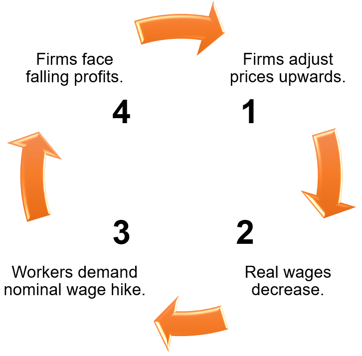 When workers observe that the prices of goods and services have risen, they will ask for higher wages to maintain their purchasing power and if employers accede to this demand, they will have to charge higher prices for their goods and services in order to cover the higher wage cost. If this then leads to further wage demands and price increases, the result is a wage-price spiral, which is very difficult to reverse.