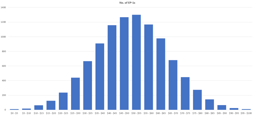 Using Microsoft Excel’s inbuilt normal distribution function, and iterating over 10,000 simulated EP-1 actual values, he constructs a normal distribution to the actual value of EP-1s sold.