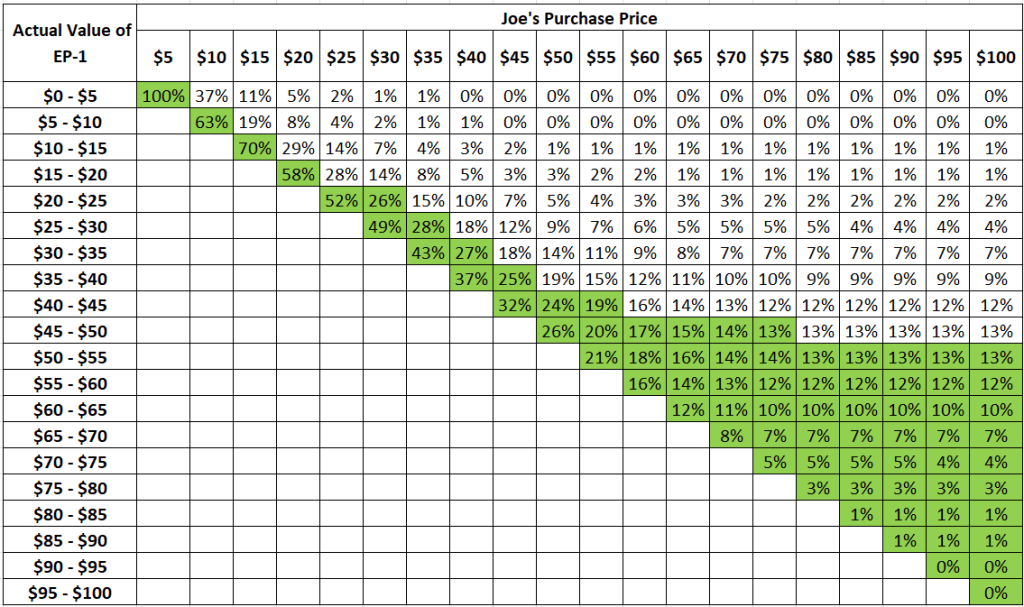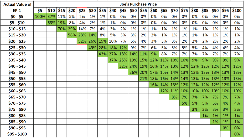 We can see how this works with an example, starting first with a “50-50” approach, where Joe is happy as long as the true value of the EP-1 purchased is within the top 50% of the EP-1s that sellers would be willing to sell to Joe, for his purchase price.