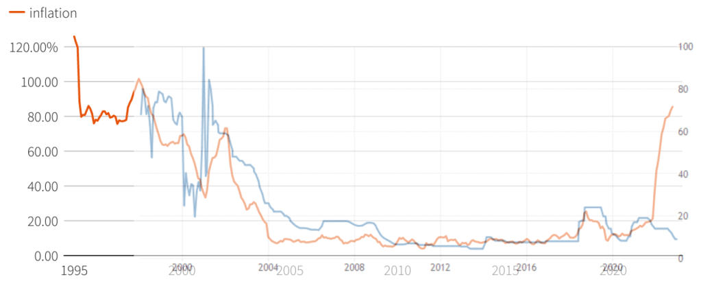 But Turkey has stood out a lot more in recent years, with its unwavering commitment to cut interest rates despite (and/or causing) the dizzying high inflation rate of 85.5% this year: