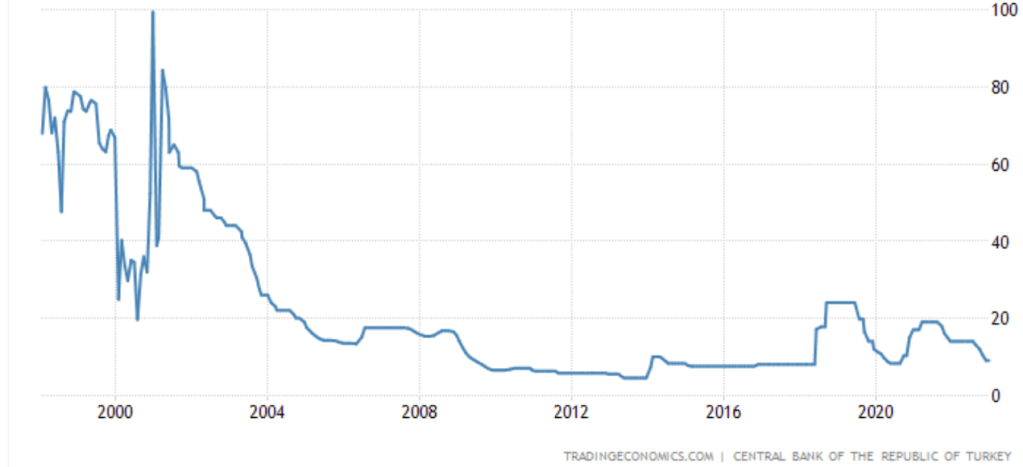 Below, we have the trend of interest rates over >25 years courtesy of data from the Türkiye Cumhuriyet Merkez Bankası (Central Bank of the Republic of Turkey), compiled by Trading Economics: