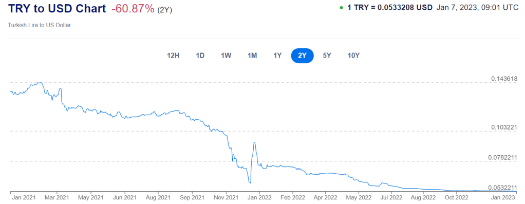 In the case of Turkey, the value of its currency, the Lira, has been commonly described as “crashed”, losing 60% of its value against the USD over the last 2 years: