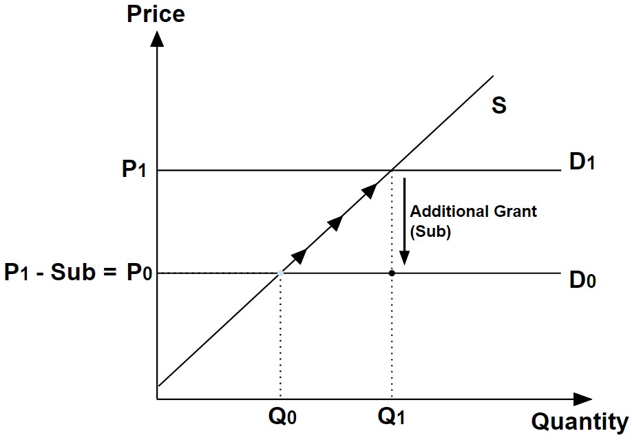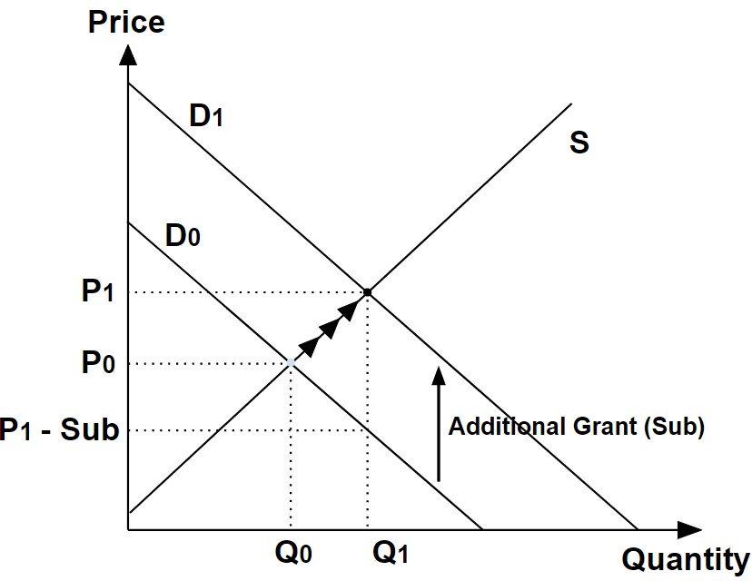 As the buyers are now more willing and able to pay for what essentially is the same number of houses sold in the market, the market price will rise by the same amount as the subsidy, effectively negating any cost savings that the additional grant should have granted to the buyer, since P1 – Sub = P0 .