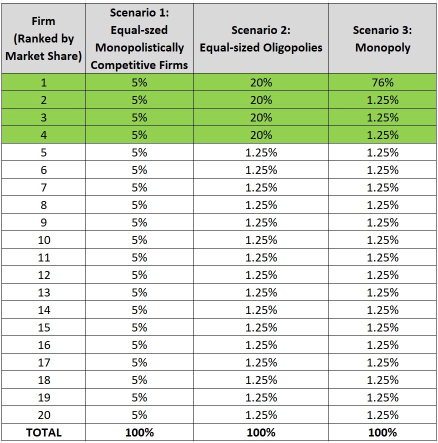 We can easily see that the 4-firm concentration ratio indeed scales with the market concentration between the largest firms, and at 20%, the ratio calculated for Scenario 1 (Monopolistically Competitive) correctly yields the lowest figure.