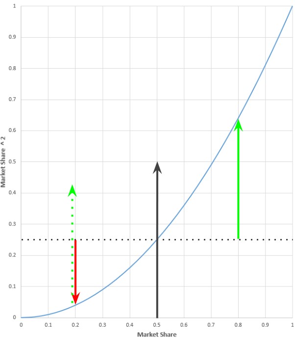 Squaring each market shares to calculate the HHI gives the observation that the squared market share of the larger firm (green arrow) yields a greater increase than the corresponding fall for the same of the smaller firm (red arrow). Placing the green arrow (dotted) next to the red arrow makes this difference even clearer.