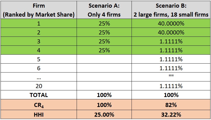An example would be a case of comparing between a market with 4 equally sized firms, and with one having 20 firms, but with most of the market share concentrated with just 2 firms.